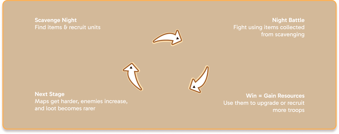 BATTLE > COLLECT > UPGRADE SKILL & RECRUIT > BATTLE